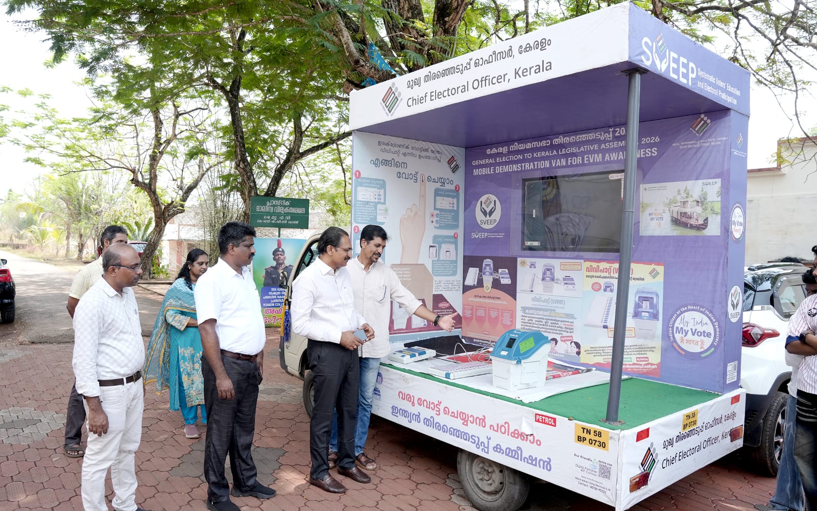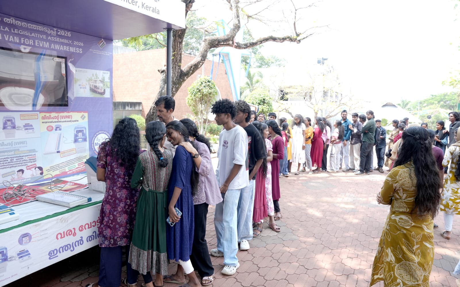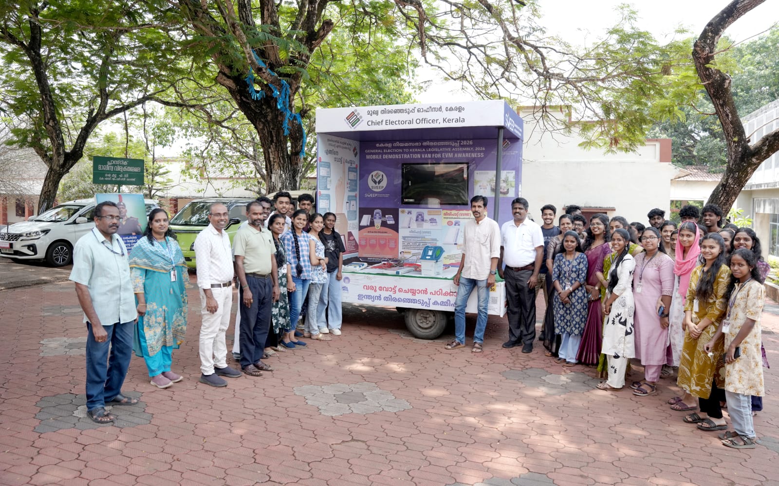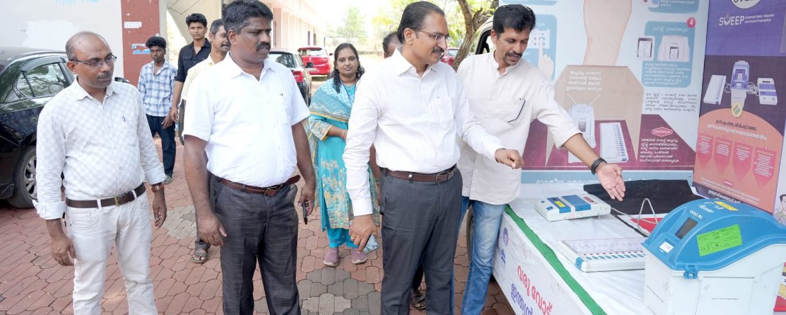 വിദ്യാർത്ഥികൾക്കും പൊതുജനങ്ങൾക്കും ഇലക്ട്രോണിക് വോട്ടിംഗ് മെഷീൻ (ഇവിഎം) പ്രവർത്തനങ്ങളെക്കുറിച്ച് അവബോധം നൽകുന്നതിനായി സംഘടിപ്പിച്ചിരിക്കുന്ന ഇവിഎം ഡെമോൺസ്ട്രേഷൻ പ്രചരണ വാഹന യാത്ര ശാസ്താംകോട്ട കുമ്പളത്ത് ശങ്കുപ്പിള്ള മെമ്മോറിയൽ ദേവസ്വം ബോർഡ് കോളേജിൽ എത്തിച്ചേർന്നപ്പോൾ.