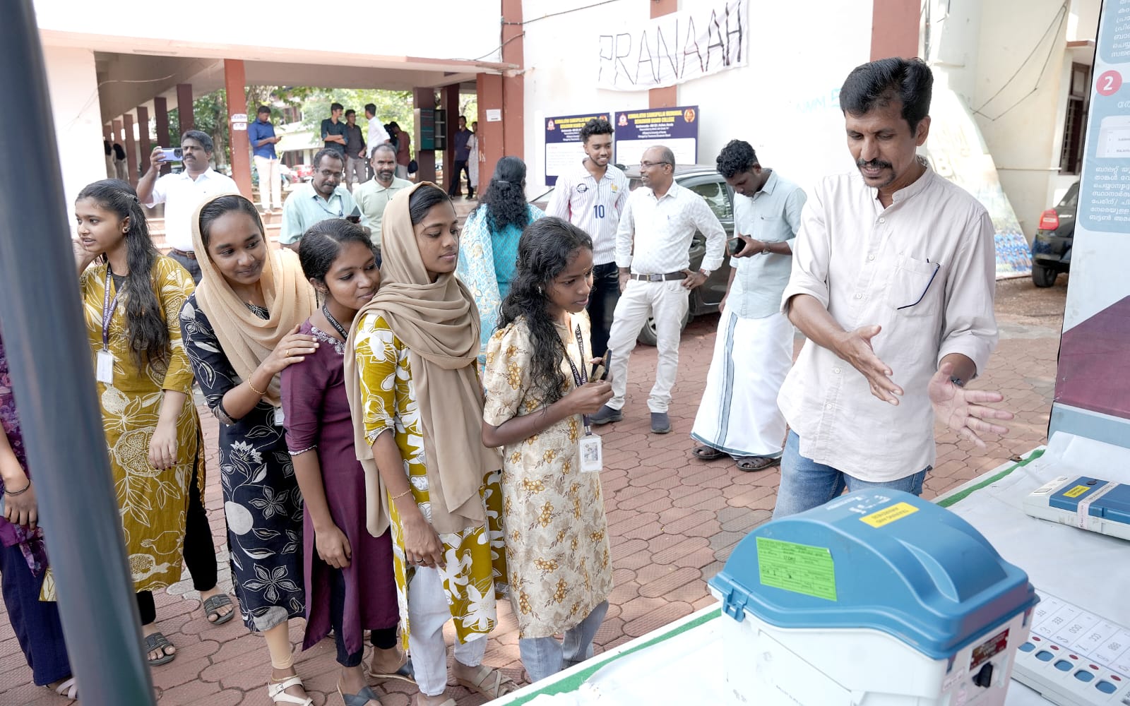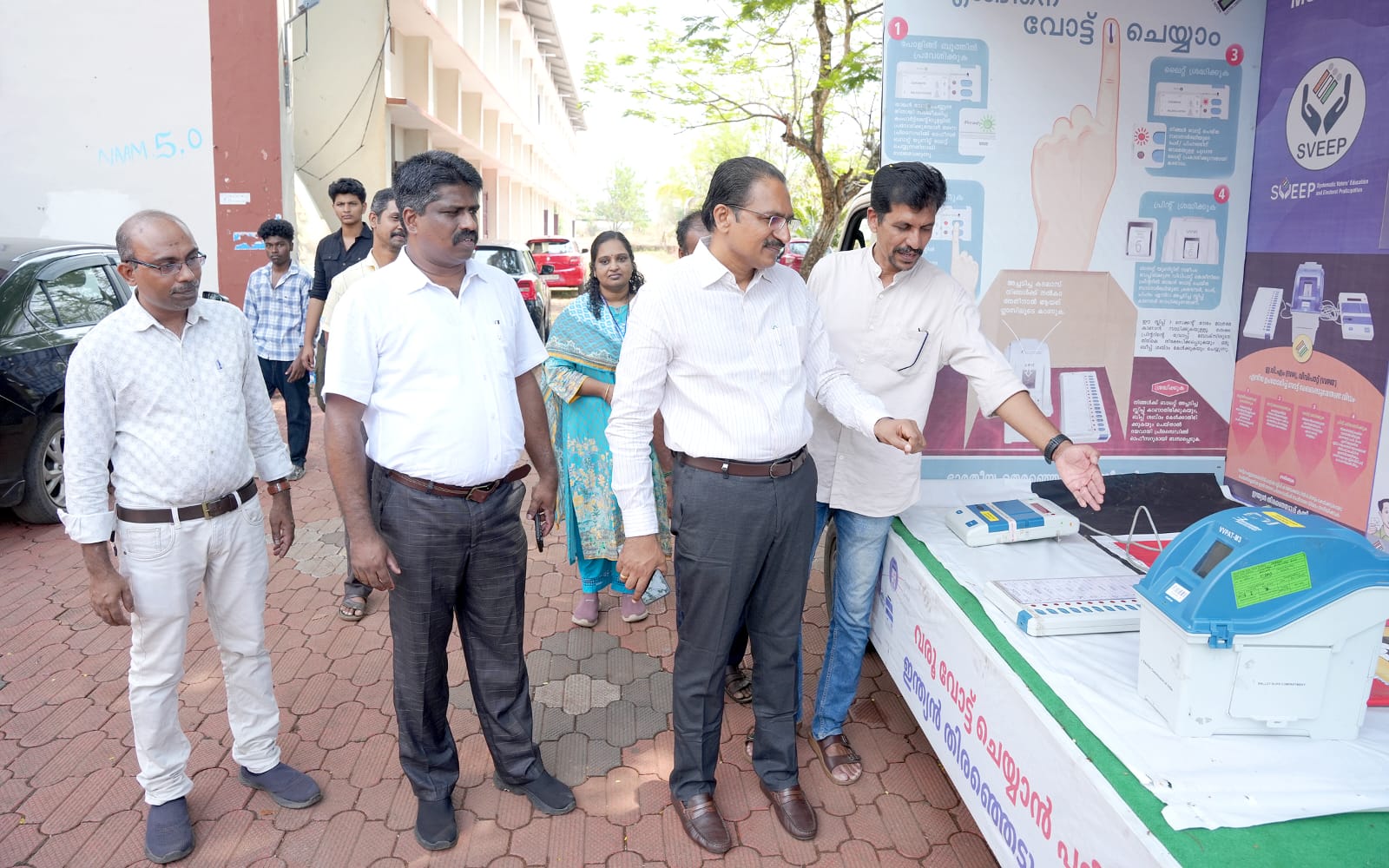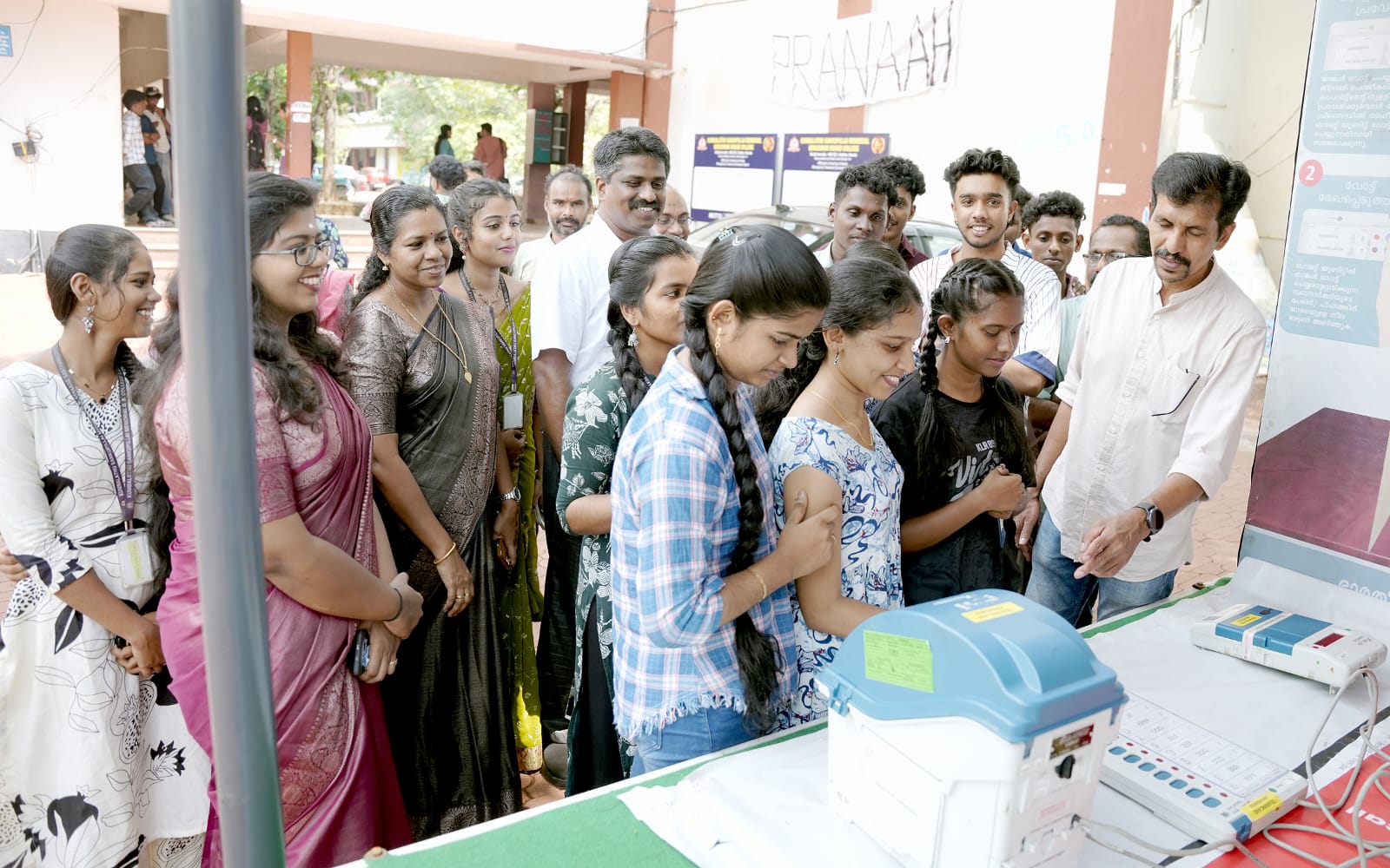 വിദ്യാർത്ഥികൾക്കും പൊതുജനങ്ങൾക്കും ഇലക്ട്രോണിക് വോട്ടിംഗ് മെഷീൻ (ഇവിഎം) പ്രവർത്തനങ്ങളെക്കുറിച്ച് അവബോധം നൽകുന്നതിനായി സംഘടിപ്പിച്ചിരിക്കുന്ന ഇവിഎം ഡെമോൺസ്ട്രേഷൻ പ്രചരണ വാഹന യാത്ര ശാസ്താംകോട്ട കുമ്പളത്ത് ശങ്കുപ്പിള്ള മെമ്മോറിയൽ ദേവസ്വം ബോർഡ് കോളേജിൽ എത്തിച്ചേർന്നപ്പോൾ.