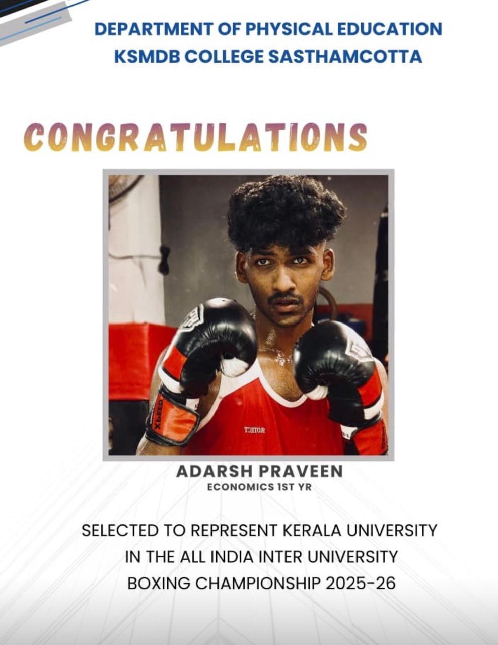 കേരള സർവകലാശാല ബോക്സിങ്ങ് ചാമ്പ്യൻഷിപ്പിൽ 80 + വിഭാഗത്തിൽ രണ്ടാം സ്ഥാനം നേടിയ മൂന്നാം വർഷ ഇക്കണോമിക്സ് വിദ്യാർത്ഥിയായ കണ്ണൻ സാജു.