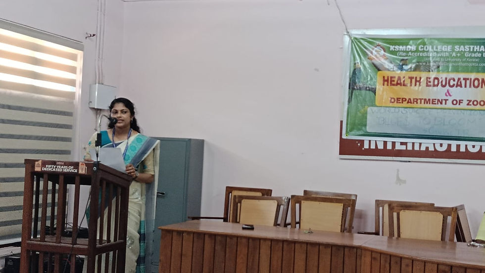 Dept. of Zoology in association with Health Education Club, KSMDB College, Sasthamcotta, conducted a seminar in connection with the World Suicide Prevention Day -“Blues to Bloom”, on 12th September 2023 @ 11.00 am in Digital Seminar Hall. The programme started with prayer followed by welcome speech by Dr. Lekshmi S (Assistant Professor, Dept. of Zoology). The session was Chaired by Dr. Manju. M, HOD of Zoology and Inaugurated by Dr. K.C Prakash (Principal KSMDBC Sasthamcotta). The session was handled by the resource person, Ms. Gargi J.R (Clinical Psychologist, Jeevani Centre, KSMDB college). She forwarded a riveting speech for students to improve their mental health and help their near ones to overcome suicidal tendancy. The resource person was honored with a Memento. The felicitations were delivered by Dr. Nisha S Panicker and Dr. Binusree S. Jayan (Members of Health Club, KSMDB College, Sasthamcotta). The programme was concluded with vote of thanks by Ajmiya Sajeer (III DC Zoology).