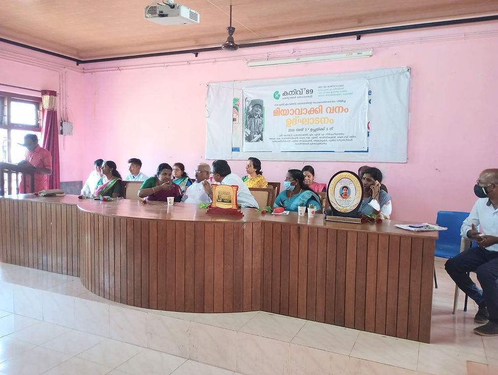 The meeting was followed by the inauguration of Miyawaki forest. The Alumni Members of Kanivu (1989 Batch Alumni Association) in cooperation with Department of Botany and Bhoomitra Sena club constructed a Miyawaki forest in the college campus with the aim of afforesting the hills . This micro forest adopts the technique of a Japanese botanist, Akira Miyawaki, who, in the 1970s, began to plant young native plant species — trees, shrubs, and grasses — in tight groves to restore degraded lands. Saplings planted close together grow rapidly as they compete for light.